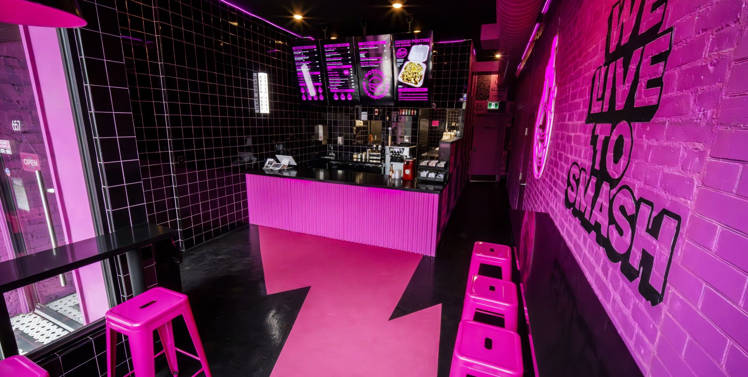 This bold and simple colour palette was carried consistently through the entire brand experience. By consistently, we mean there is not a single colour other than black and pink used in the packaging, signage or interior — even the grout between the black tile is pink.